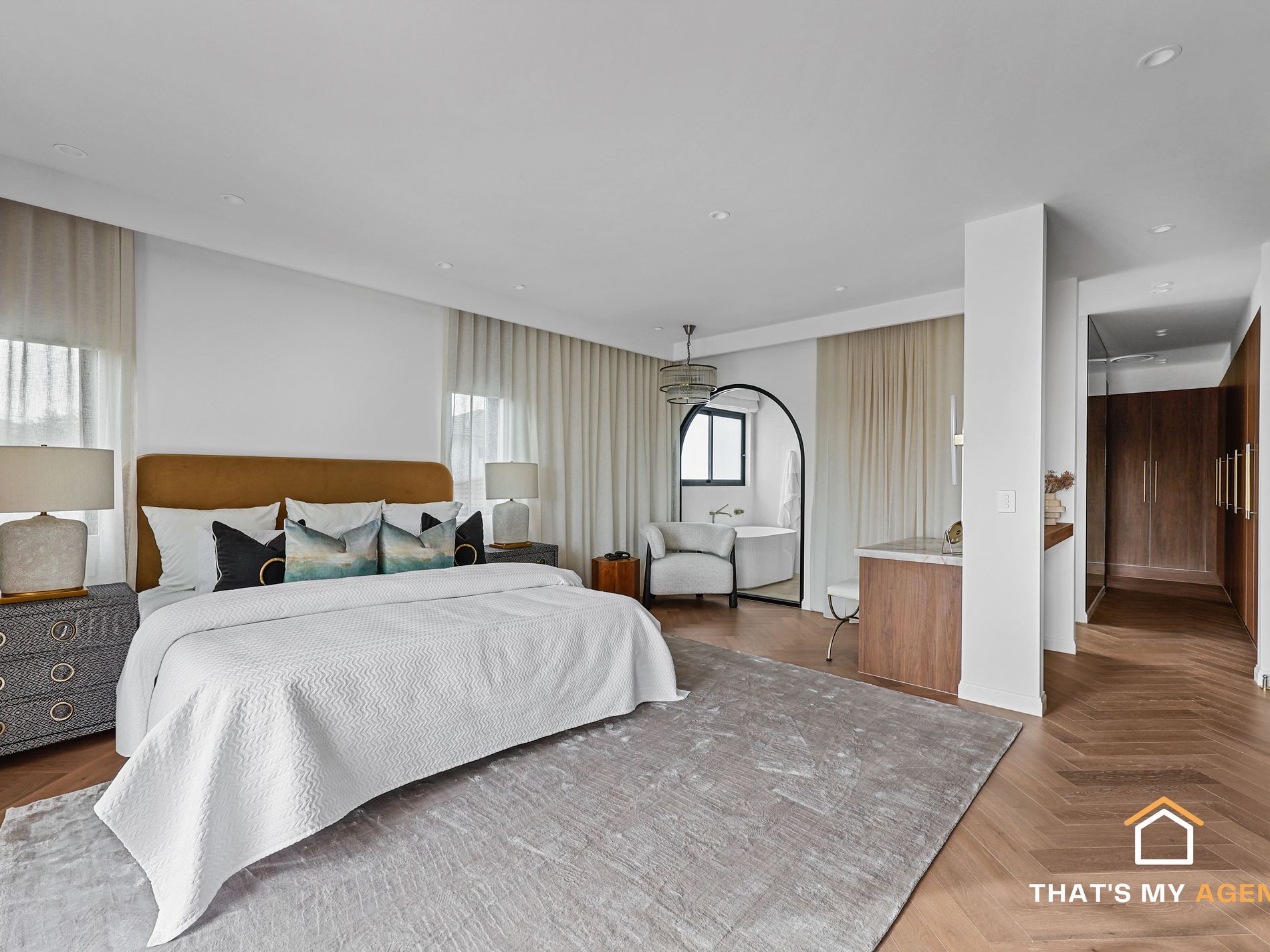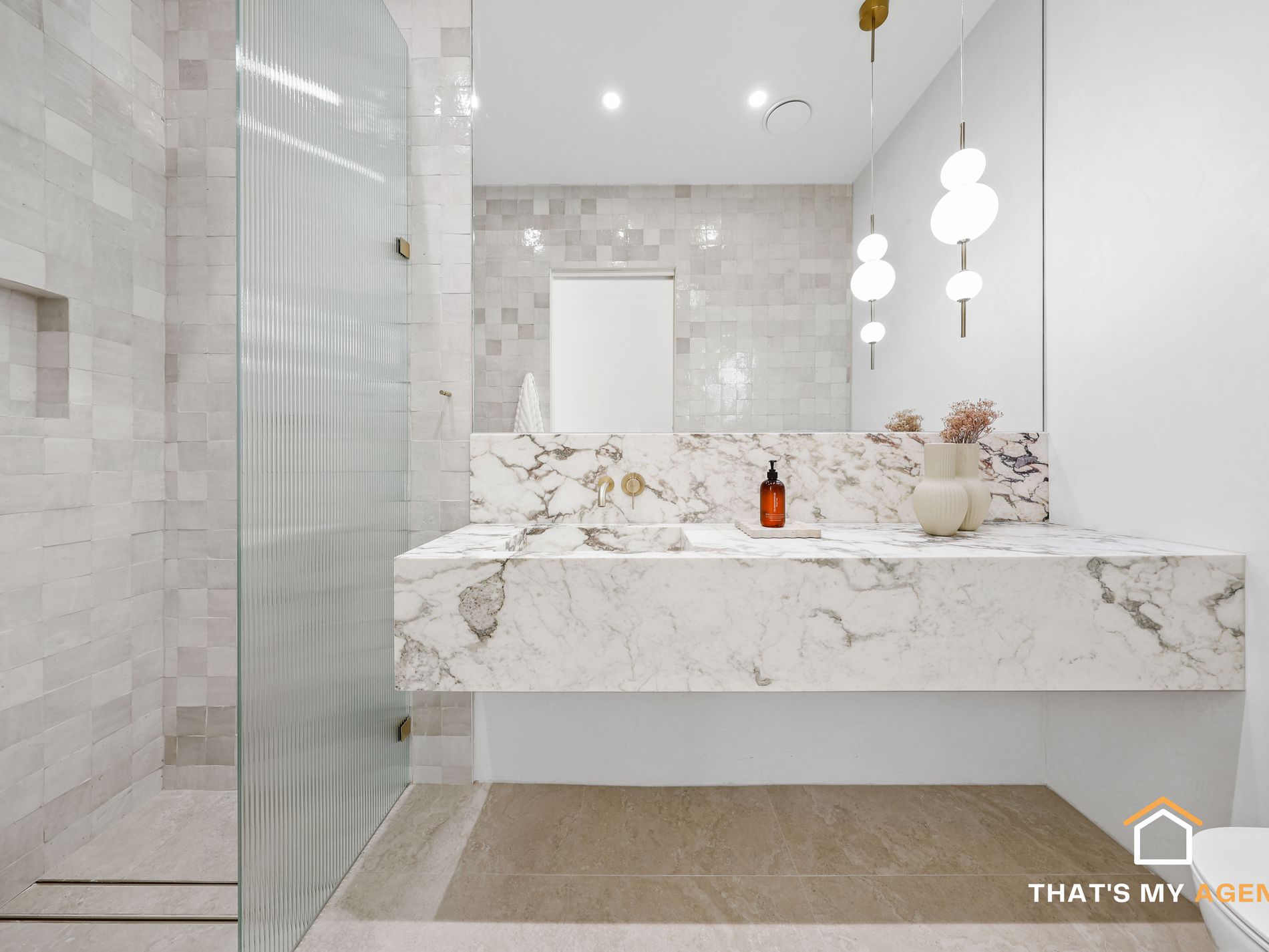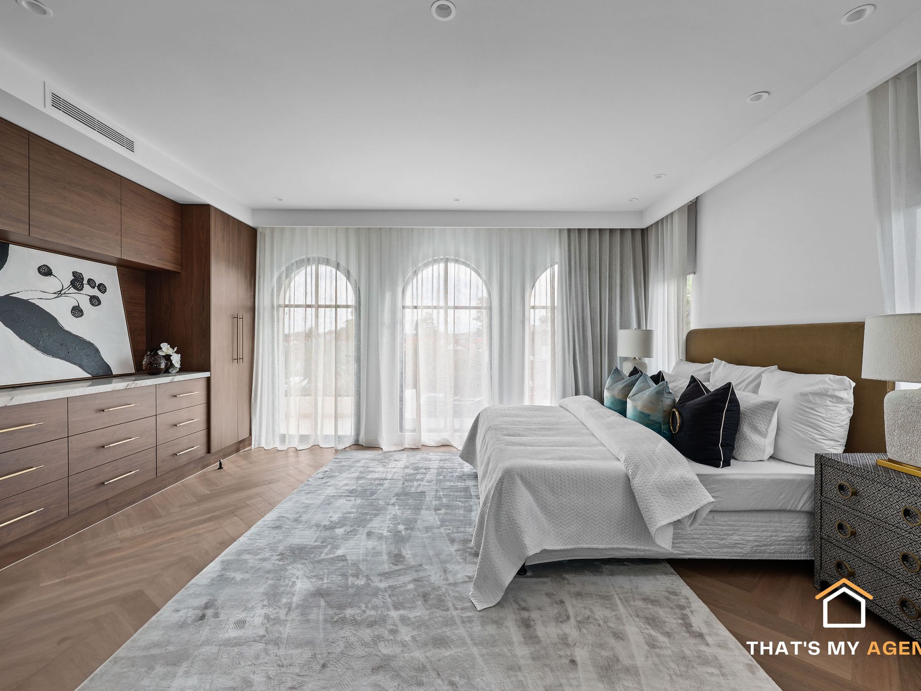 From the grand quartzite stone arch and cedar garage door to the cobblestone driveway and fluted glass front entry, every element exudes sophistication. Inside, sunlight flows across handpicked finishes — including Coco Republic designer lighting, Marmorino Venetian feature plaster, solid 2.4m timber doors, herringbone engineered timber flooring, and heated bathroom floor tiles and towel rails. Soaring 3.2m ceilings downstairs and 2.7m ceilings upstairs create a breathtaking sense of space, light, and grandeur throughout the home.