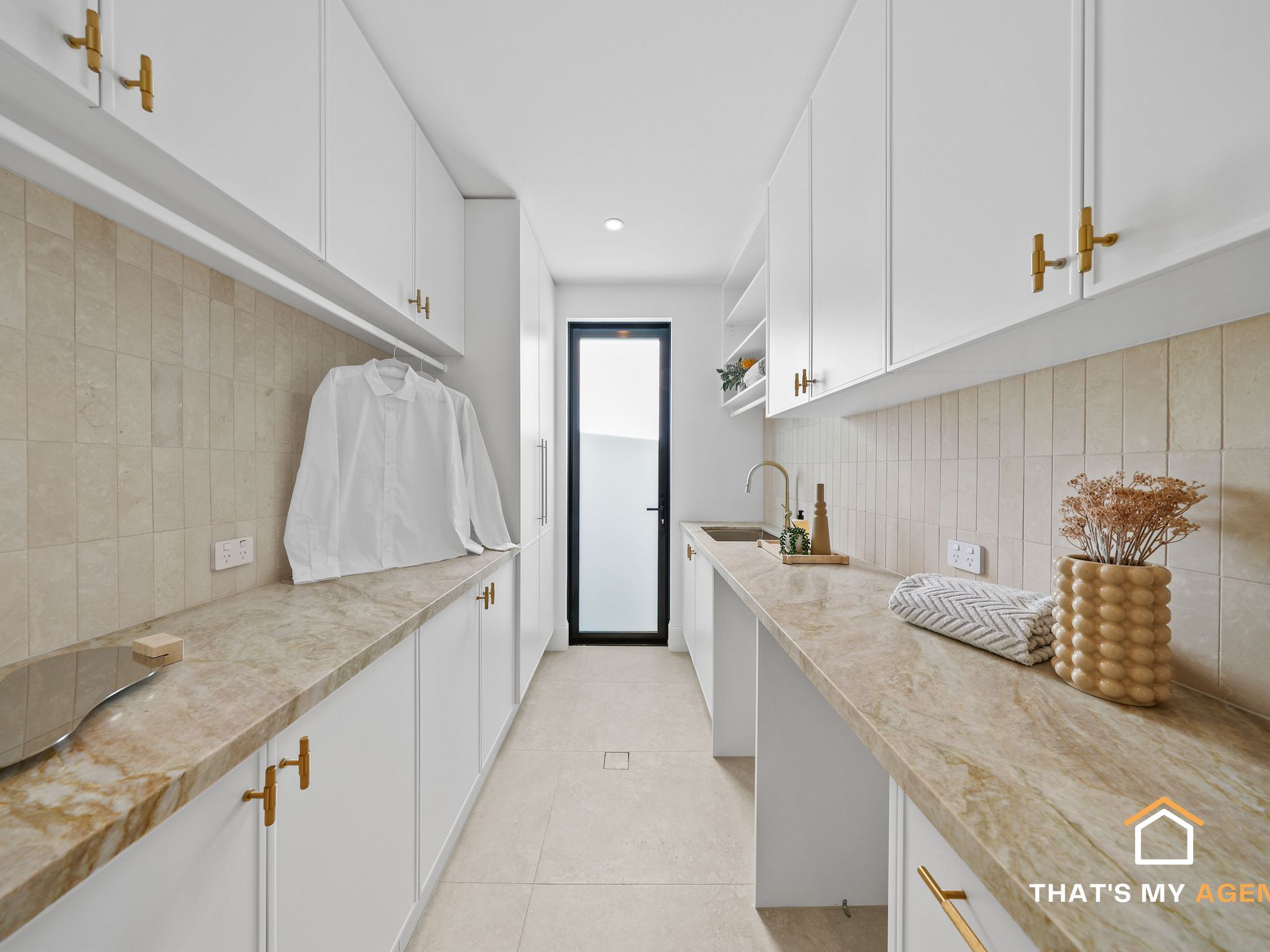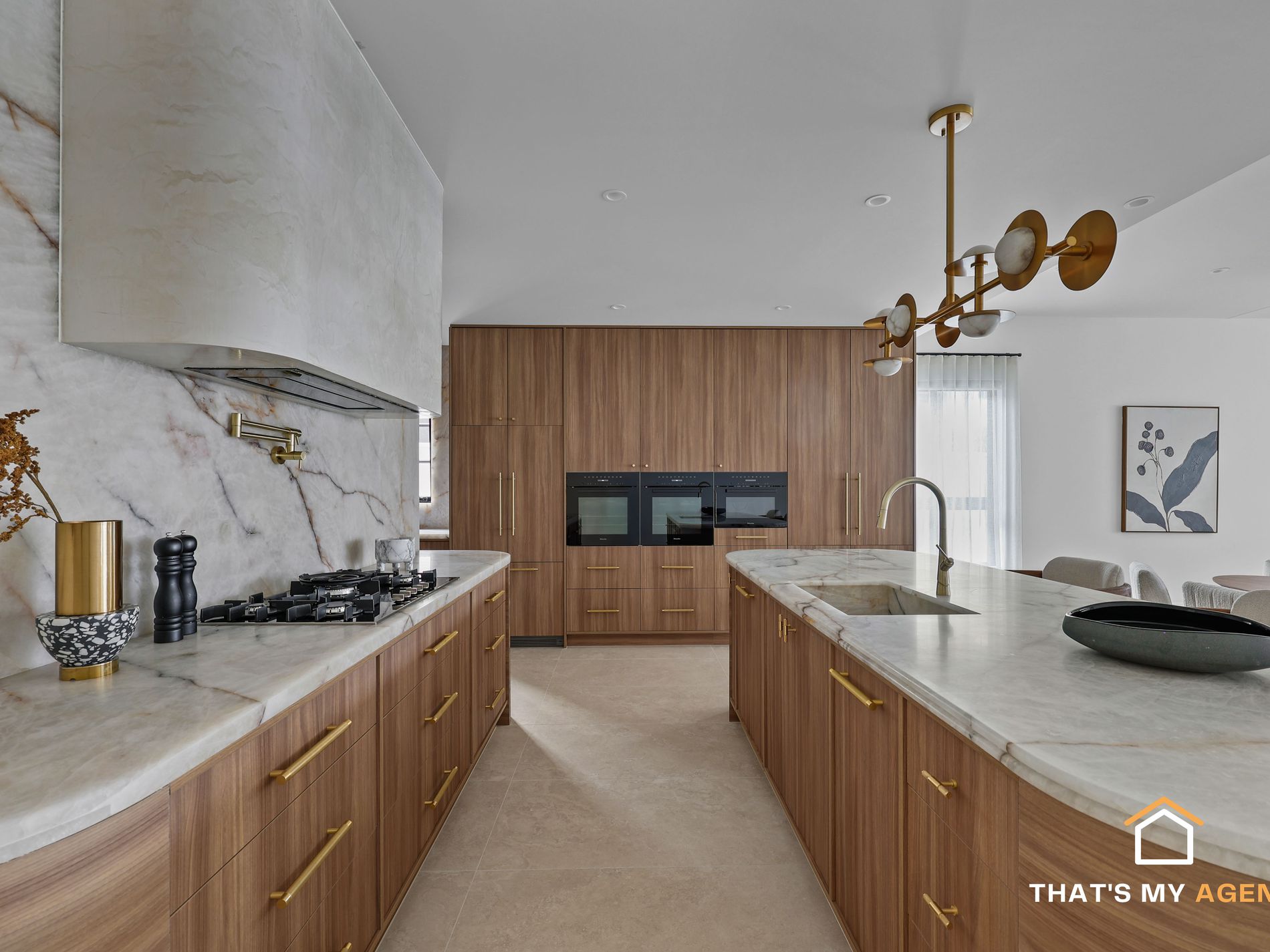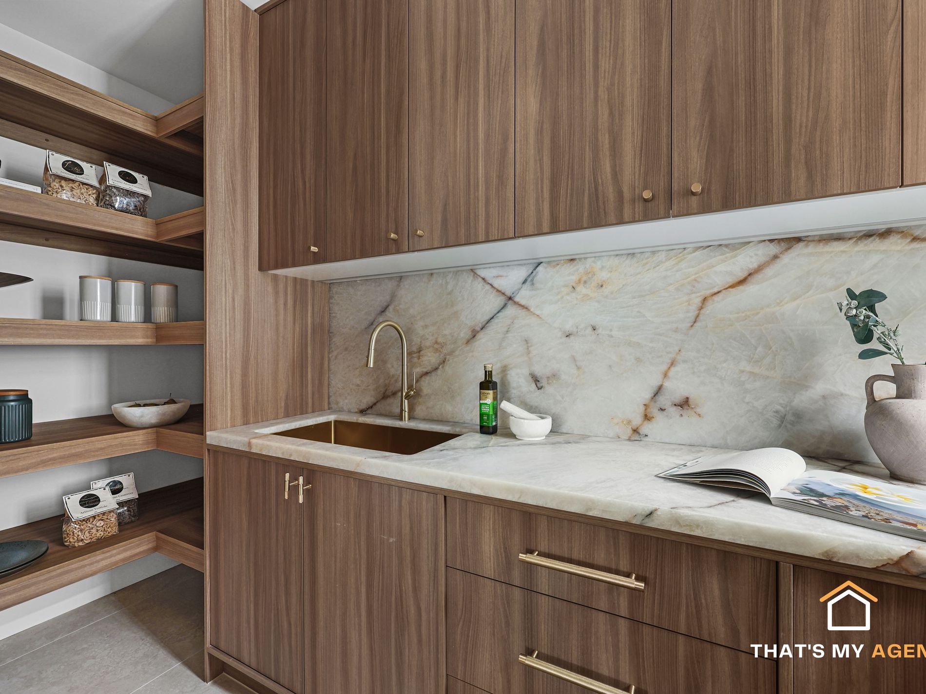 The Miele-appointed gourmet kitchen with 40mm Cristallo quartzite double bullnose breakfast bar flows into a luxe butler’s pantry featuring stone splashbacks, LED lighting, and smart pop-up power points.