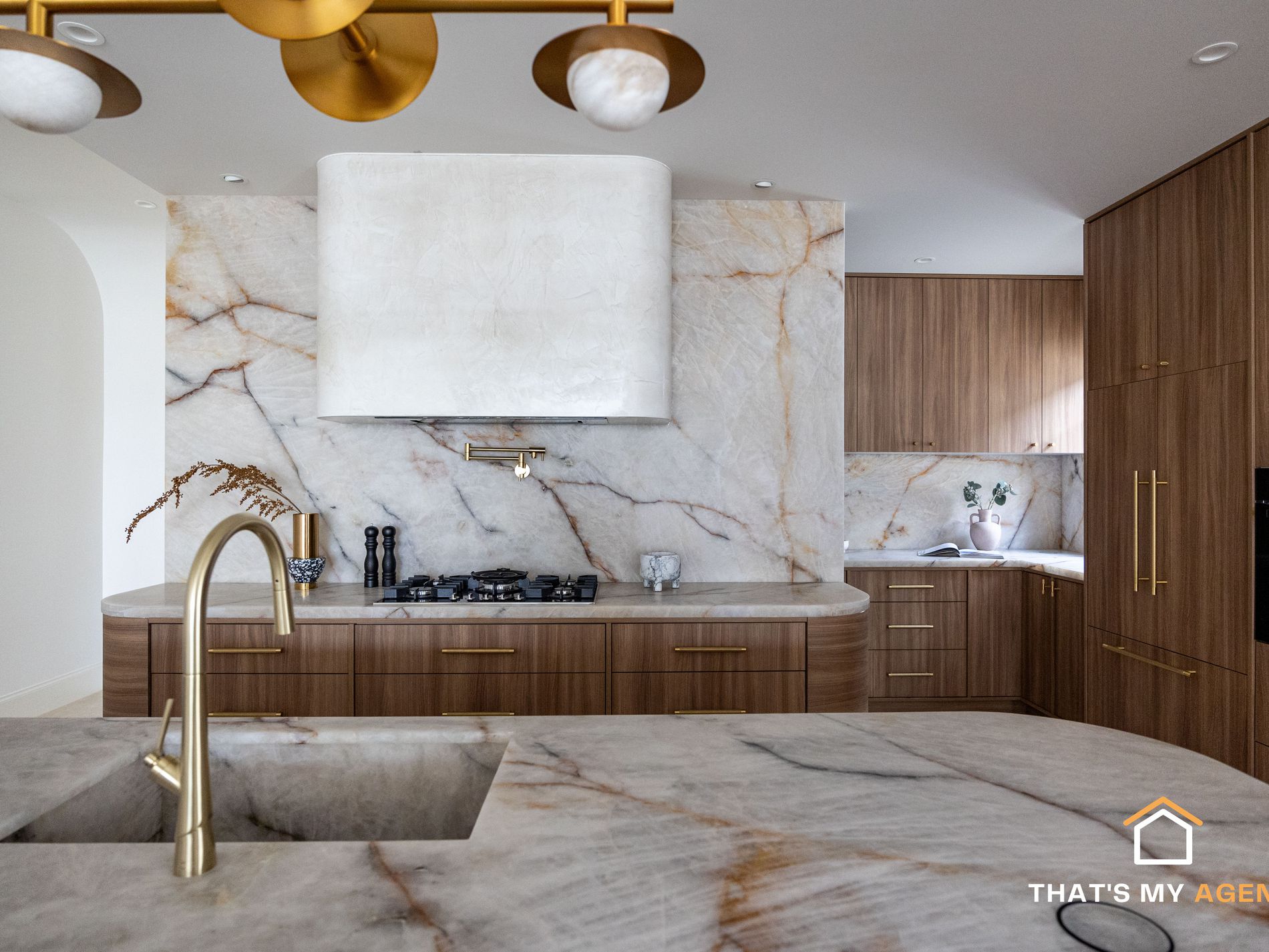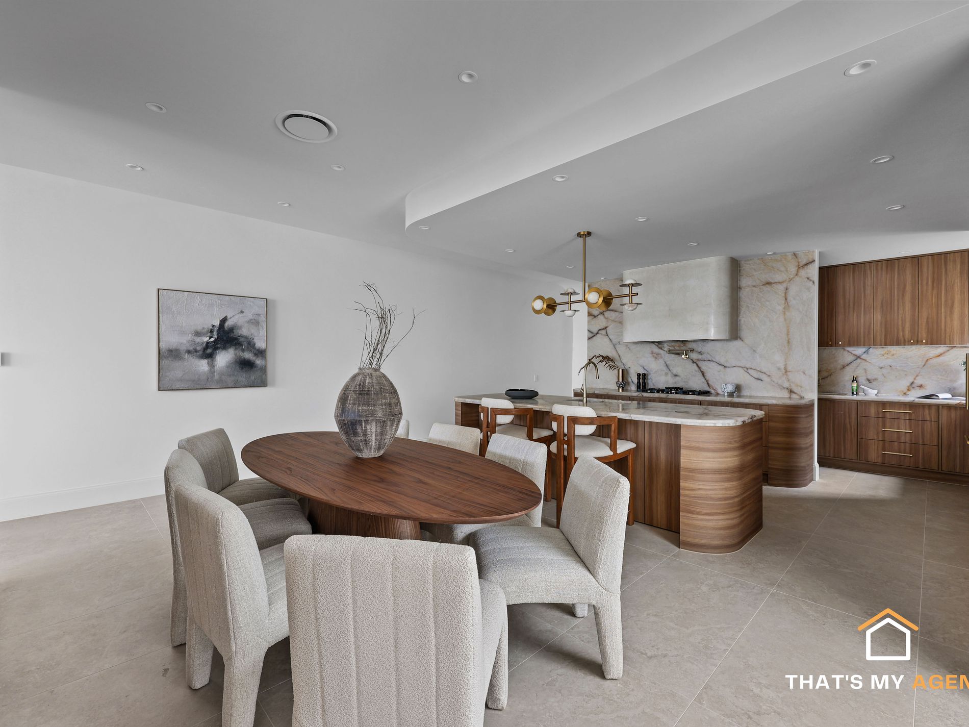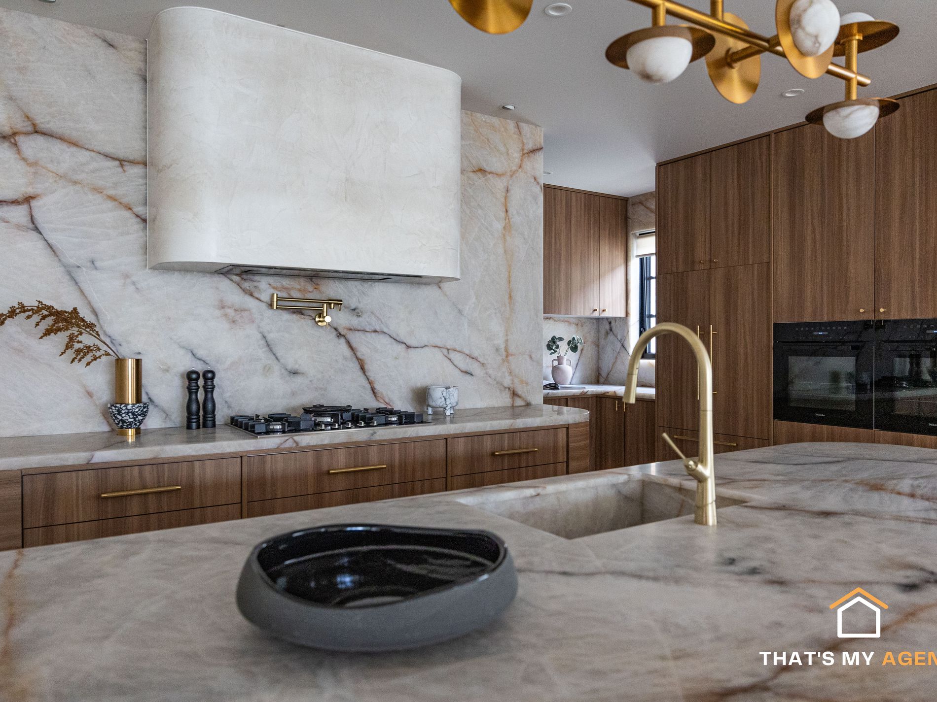 The Miele-appointed gourmet kitchen with 40mm Cristallo quartzite double bullnose breakfast bar flows into a luxe butler’s pantry featuring stone splashbacks, LED lighting, and smart pop-up power points.
