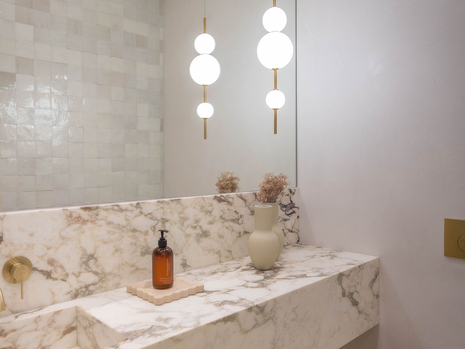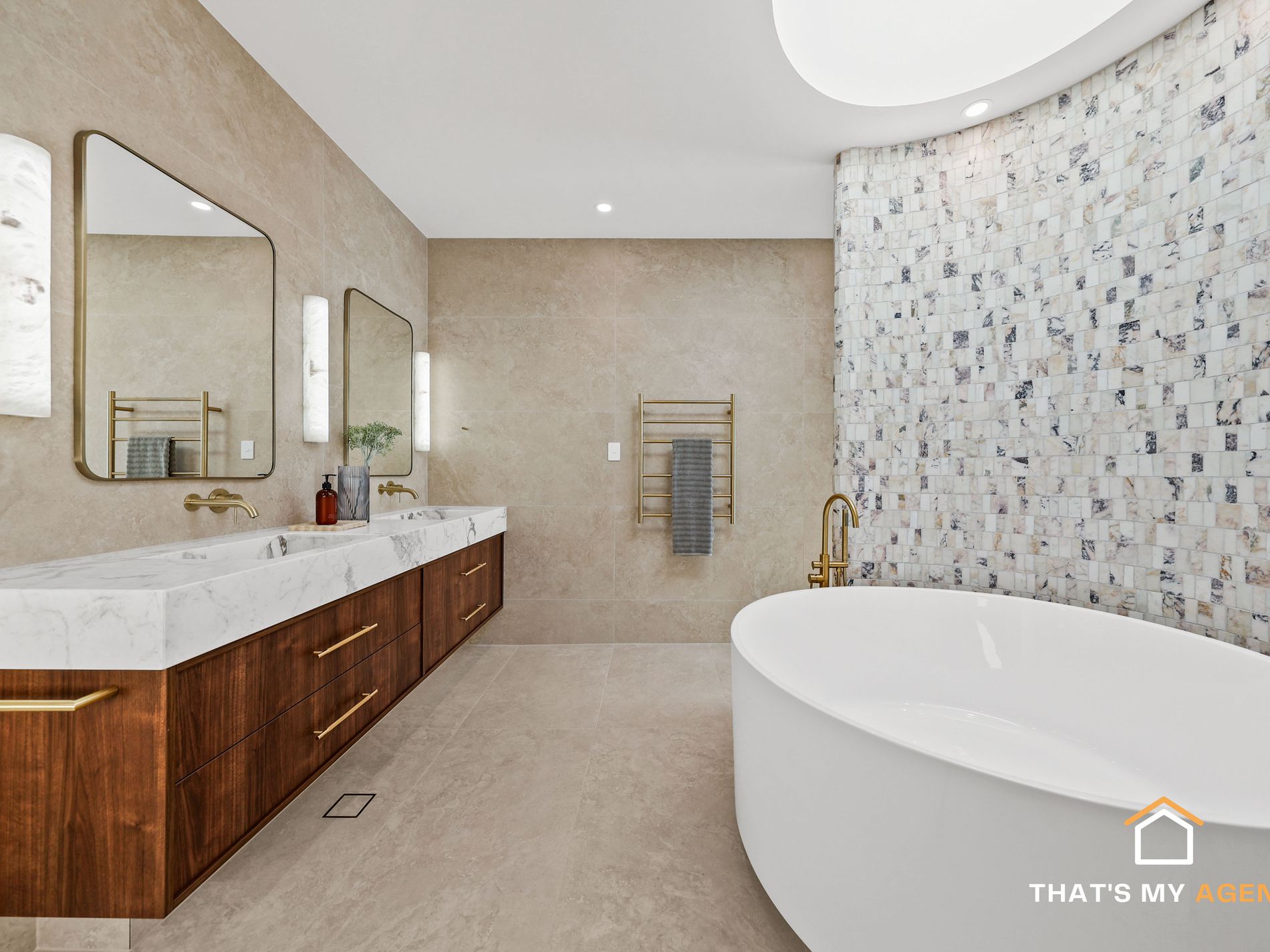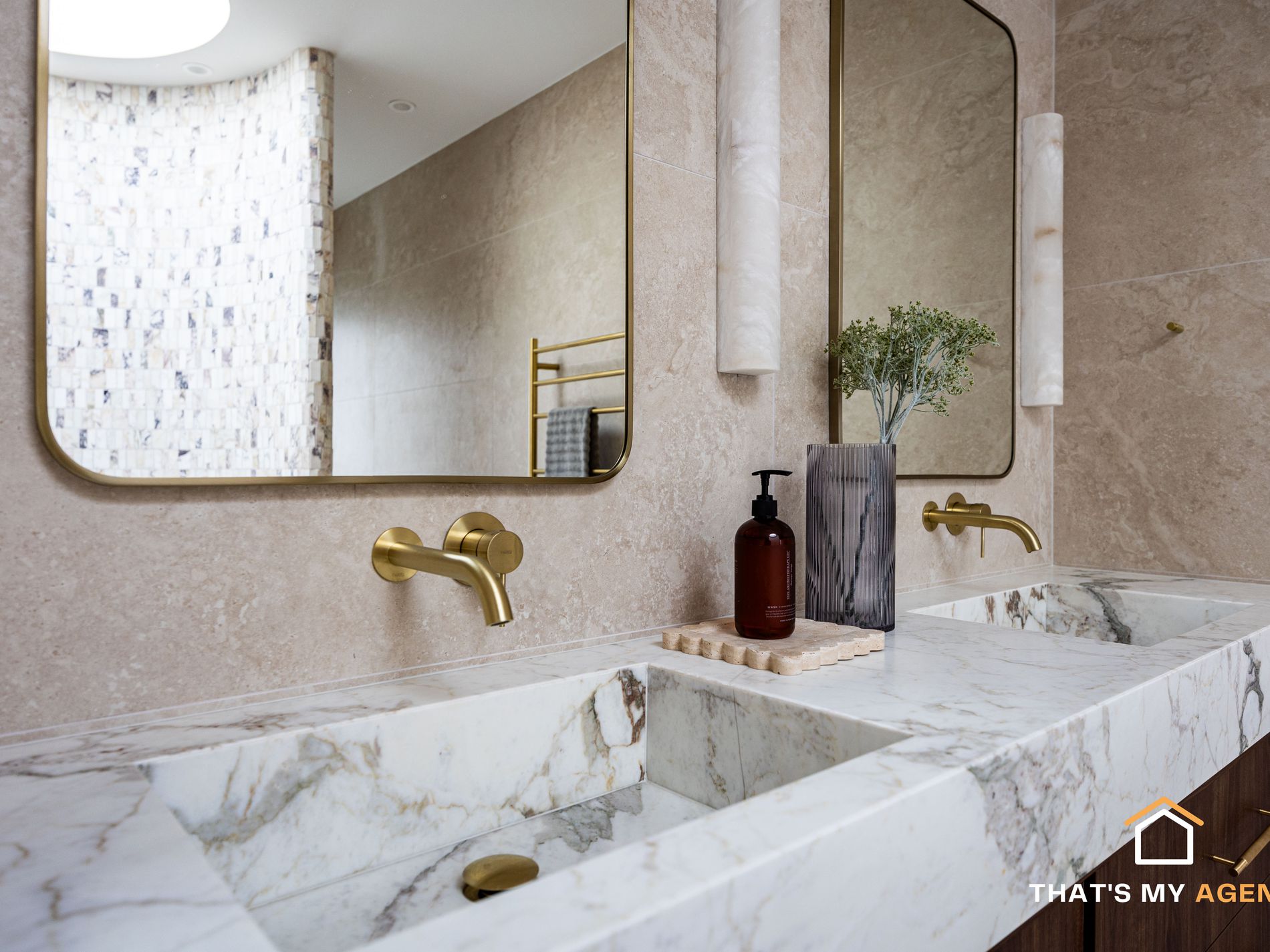 • Ensuite and bathroom with double bowl marble sinks and stone feature lighting